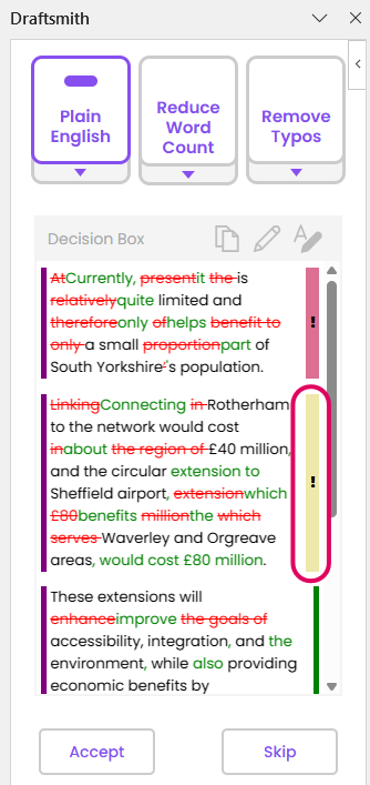 Draftsmith will also alert you with a yellow tab when a citation is detected, so you can ensure it is not changed and is formatted correctly in line with your own preferences.