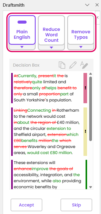 Draftsmith will automatically give you a suggestion as soon as you’ve selected your text.