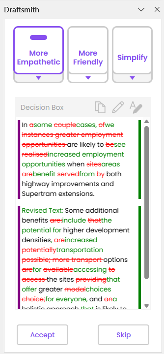 Or, if you’d like Draftsmith to highlight the changes it’s made to your text, click the A-pencil icon to show tracked changes in the Decision Box.