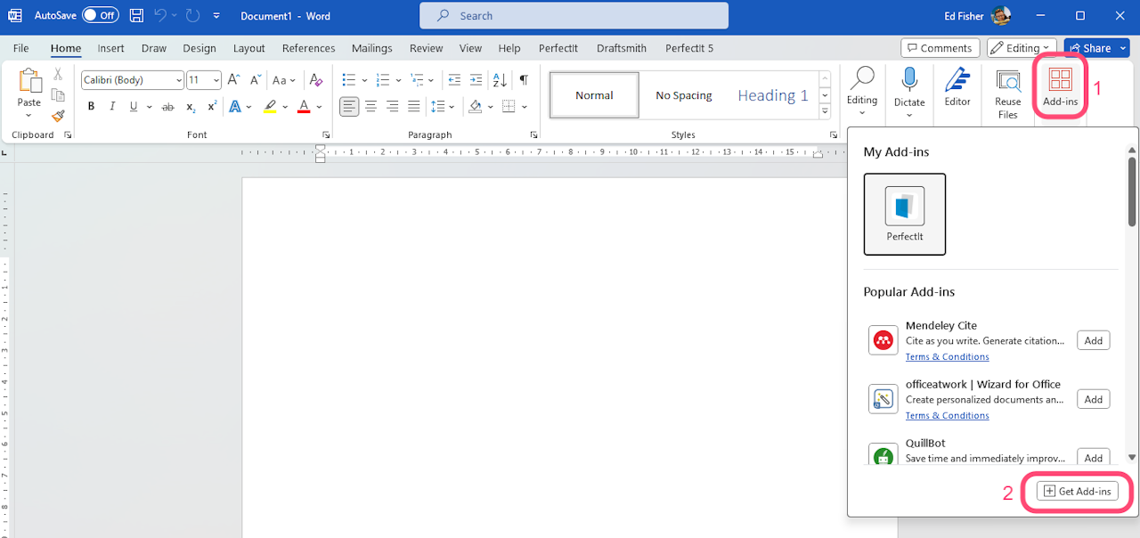To uninstall Draftsmith, in Word, click the ‘Add-ins’ icon in the Home tab, and then click "Get Add-ins" to open the Office Add-Ins store.