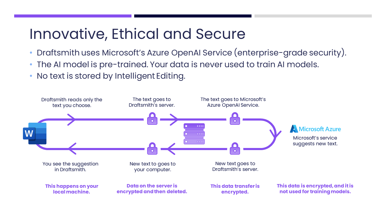 Text goes from Draftsmith (which exists on an Intelligent Editing server) to Microsoft’s Azure OpenAI Service. The suggestions are sent back to Draftsmith from there.