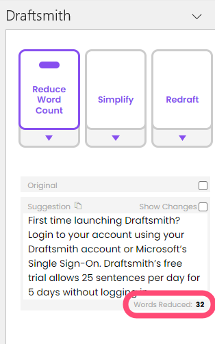 When using the Word Count Trimmer preset, the number of words the text has been reduced by will be shown in the bottom-right of the Suggestion box.