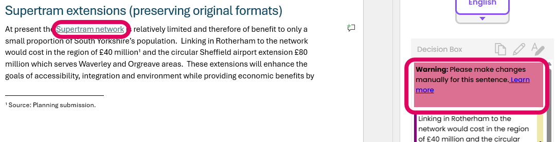 Why does Draftsmith say I must make changes manually when there is a link in my text?